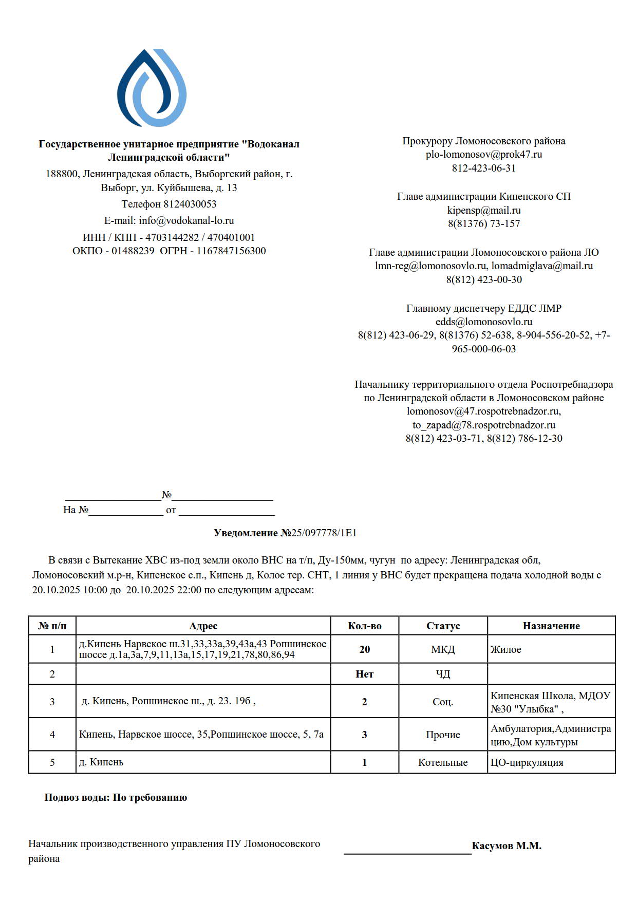 С 20.10.2025 г. 10:00 ч. до 20.10.2025 г. 22:00 ч. будет прекращена подача холодной воды Опубликовано 17.10.2025 в рубрике Объявления для населения